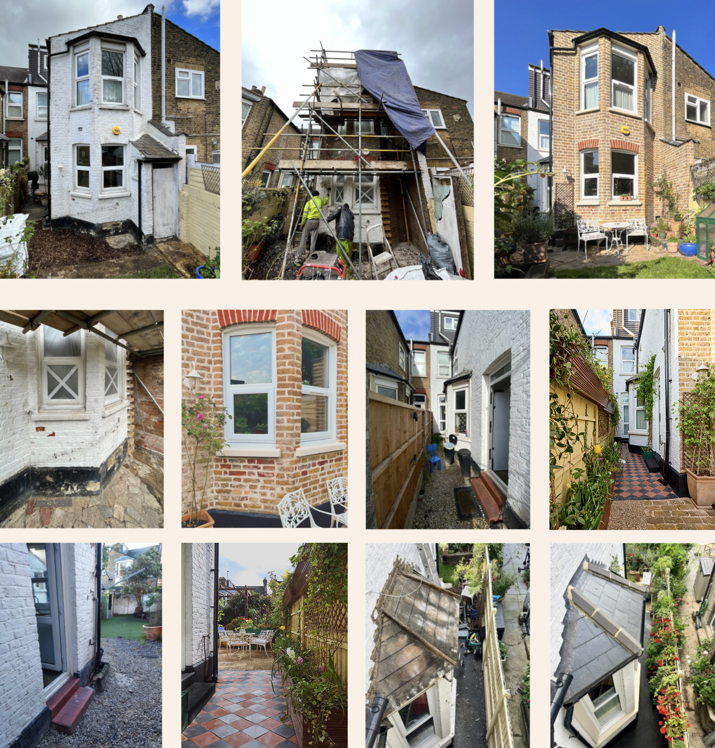 To the rear there was an outside toilet which needed to be removed before we could start stripping the paint. Once this was done the masons from PGS Stone used the DOFF steam cleaning method to remove the paint without harming the London stock brickwork. A full height scaffold went up so we could remove the paint and all the old pointing which had been done, incorrectly, in concrete. They then completely repointed all the bricks in the correct lime mortar with a stunning final result.