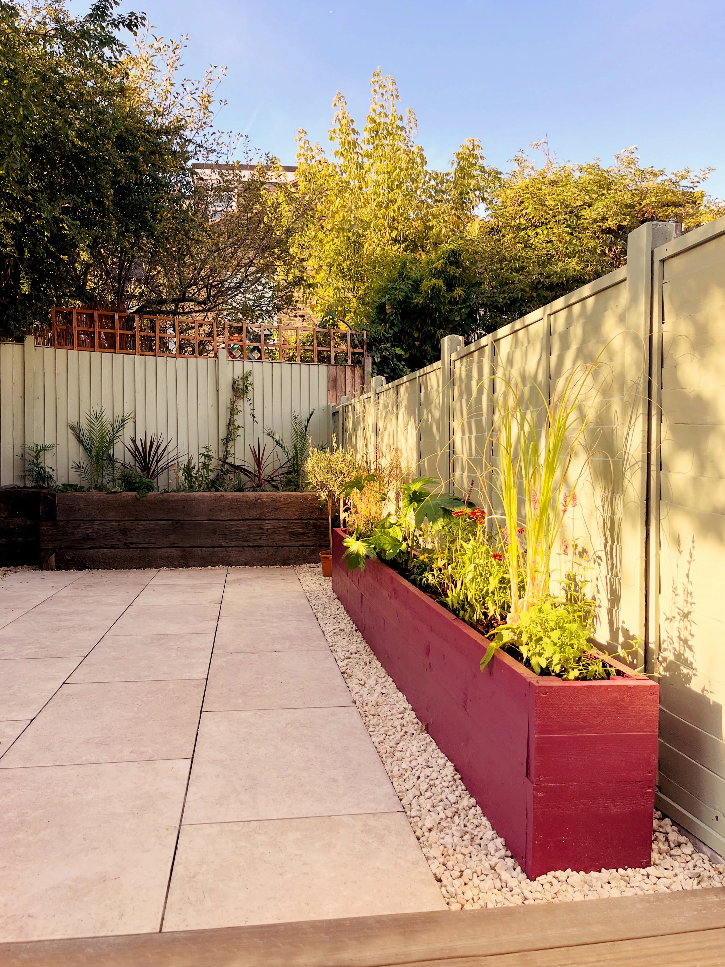 We transformed this space into a beautiful, useable oasis with plenty of space for barbecues, pizzas and entertaining. Total renovation including removal of astroturf, and fencing, clearing rubble, building two substantial raised beds, planters and storage cupboards. We also laid a beautiful outdoor porcelain terrace.