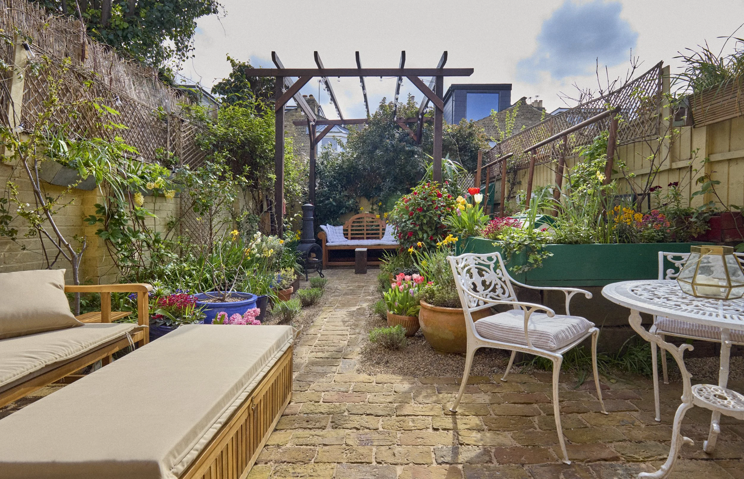 The first step was to remove all the waste material, before aerating the existing soil. We then added several tonnes of well rotted manure and topsoil as a nutrient rich base for the raised beds, made with huge reclaimed oak railway sleepers. The 1980s brick walls on the east side and at the rear were solid but lacked charm, so we opted to paint them along with the fence on the remaining side in 'County Cream' which tied them all together. The reclaimed brick patios were then started, laying hundreds of bricks at the front and the back of the garden, joined together by a matching brick path. The rear patio features a pergola and is a beautiful secluded zone, away from the house and which features a large Sissinghurst bench, a chiminea and wood store.