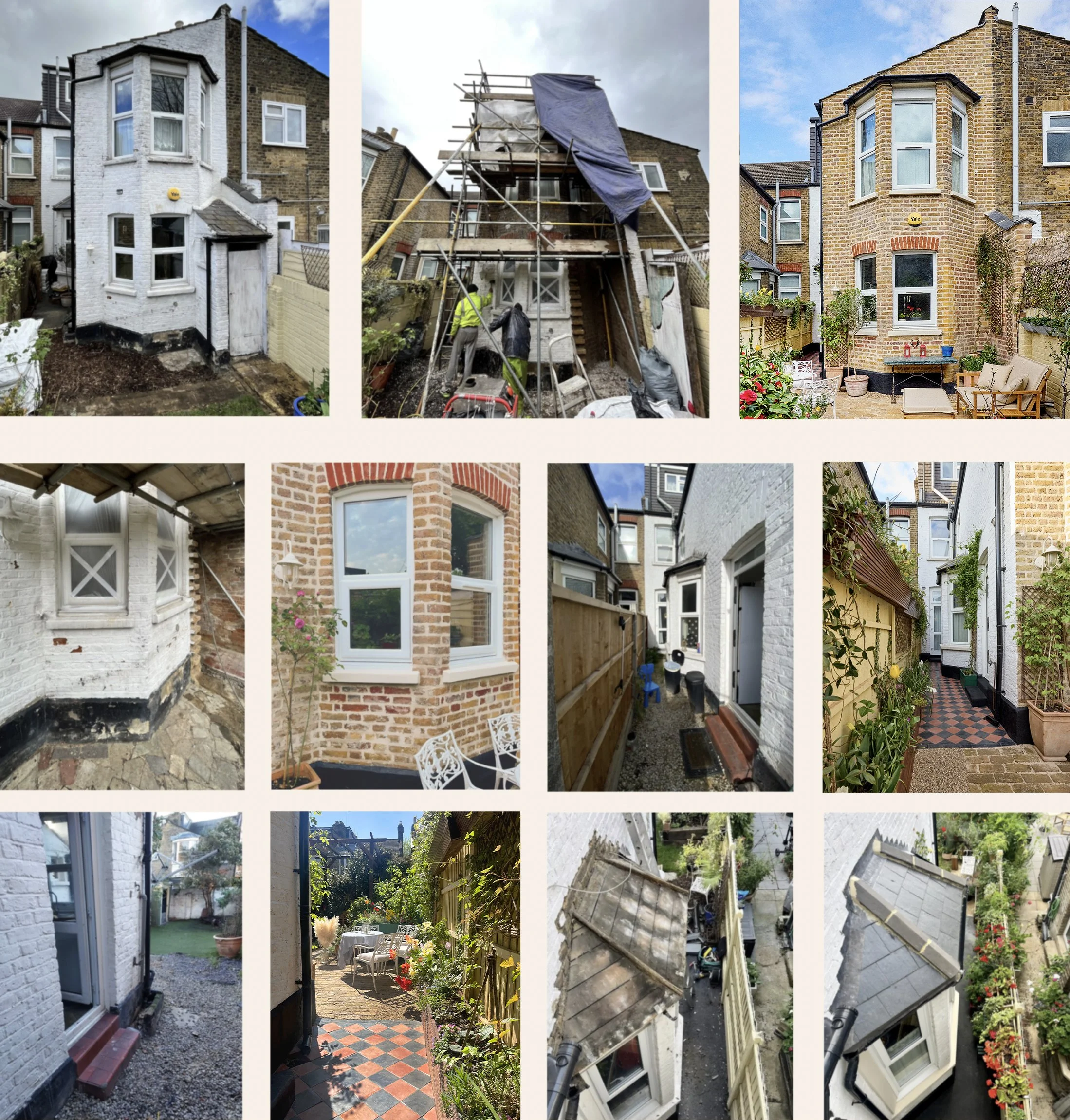 The rear of the house was covered in failing paint and there was an outside toilet which needed to be removed. The masons from PGS Stone used the DOFF steam cleaning method to remove the paint without harming the London stock brickwork. A full height scaffold went up so we could remove the paint and all the old pointing which had been done, incorrectly, in concrete. They then completely repointed all the bricks in the proper lime mortar with a stunning final result.