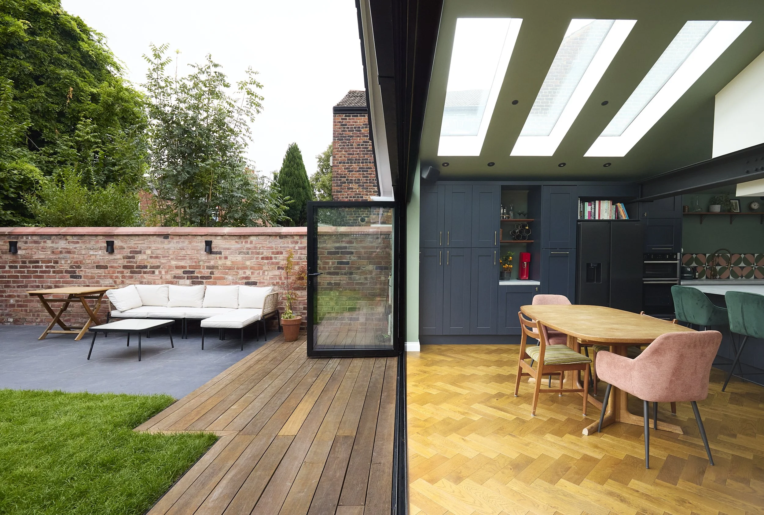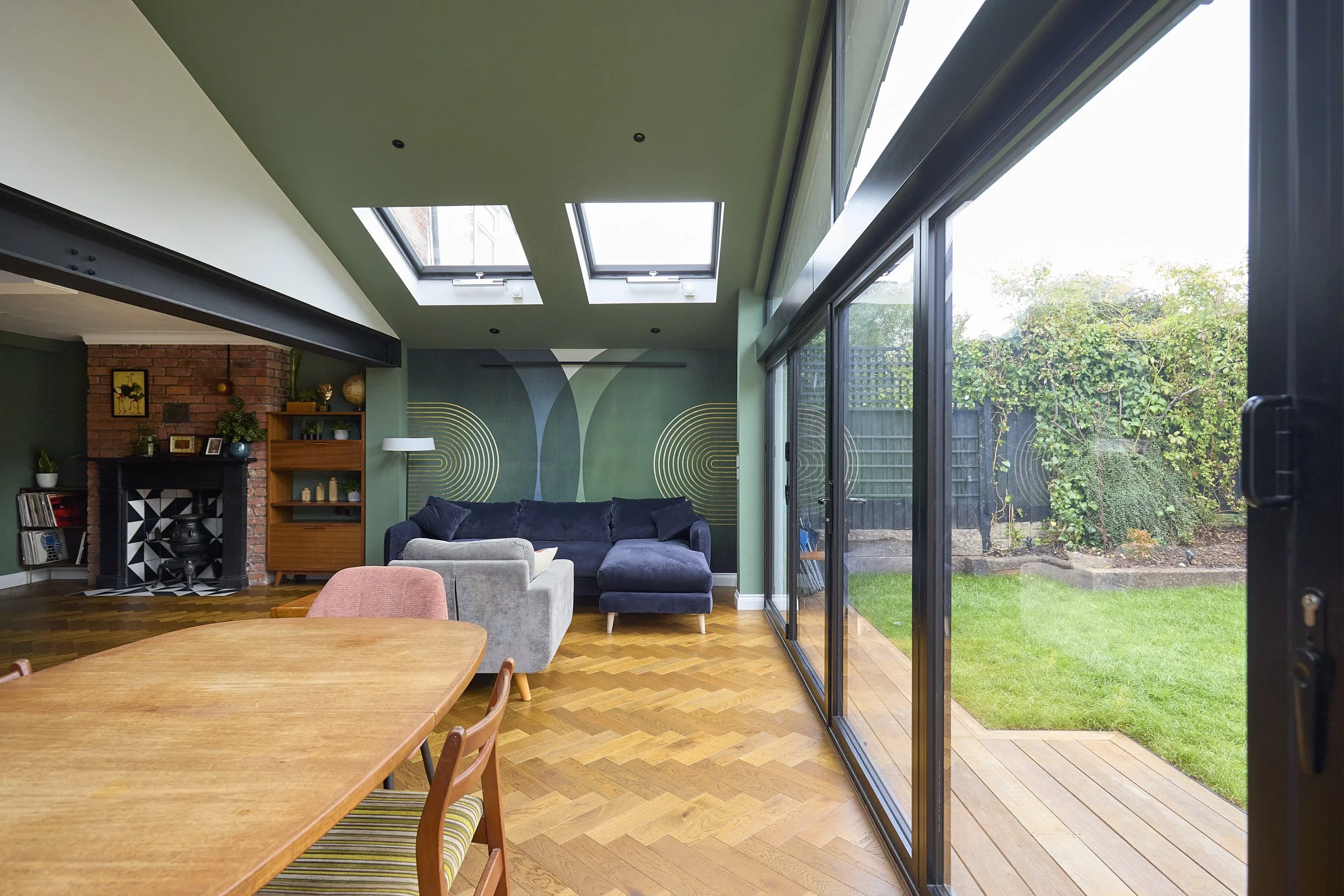 Light was a top priority and the enormous glazed front, paired with multiple electrically controlled skylights let it absolutely pour in. The bi-fold aluminium doors fully open to the garden which provides a beautiful extension of the living area for entertaining.