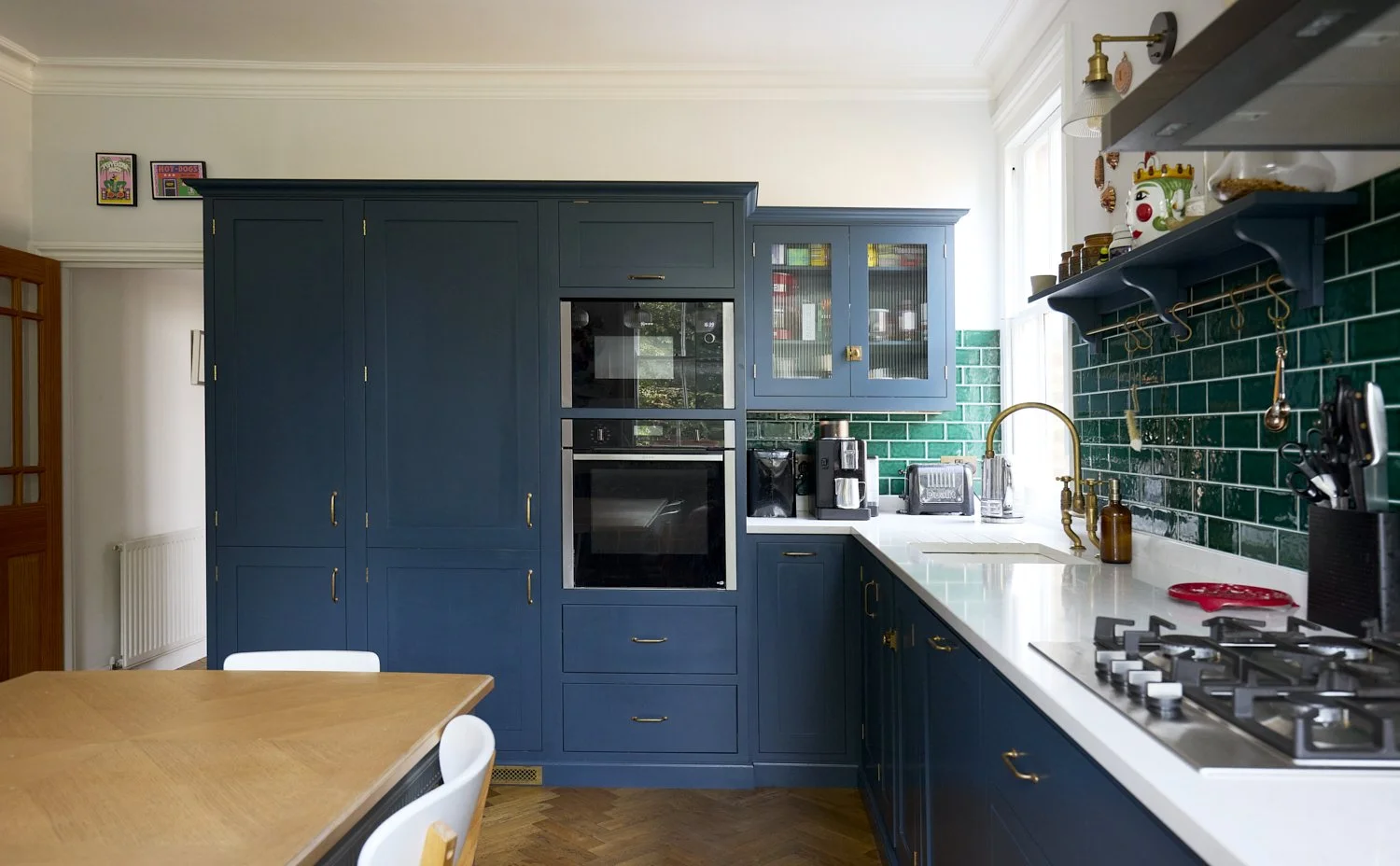 The colour of the units is Bond Street Blue which worked well to contrast with all the natural light they have in the dual aspect space. The teal tiles and muted oxblood completed the colour palette. Above the sink is a decorative shelf to subtly display some of their curated objects and the pinboard opposite gives a really lived in feel.